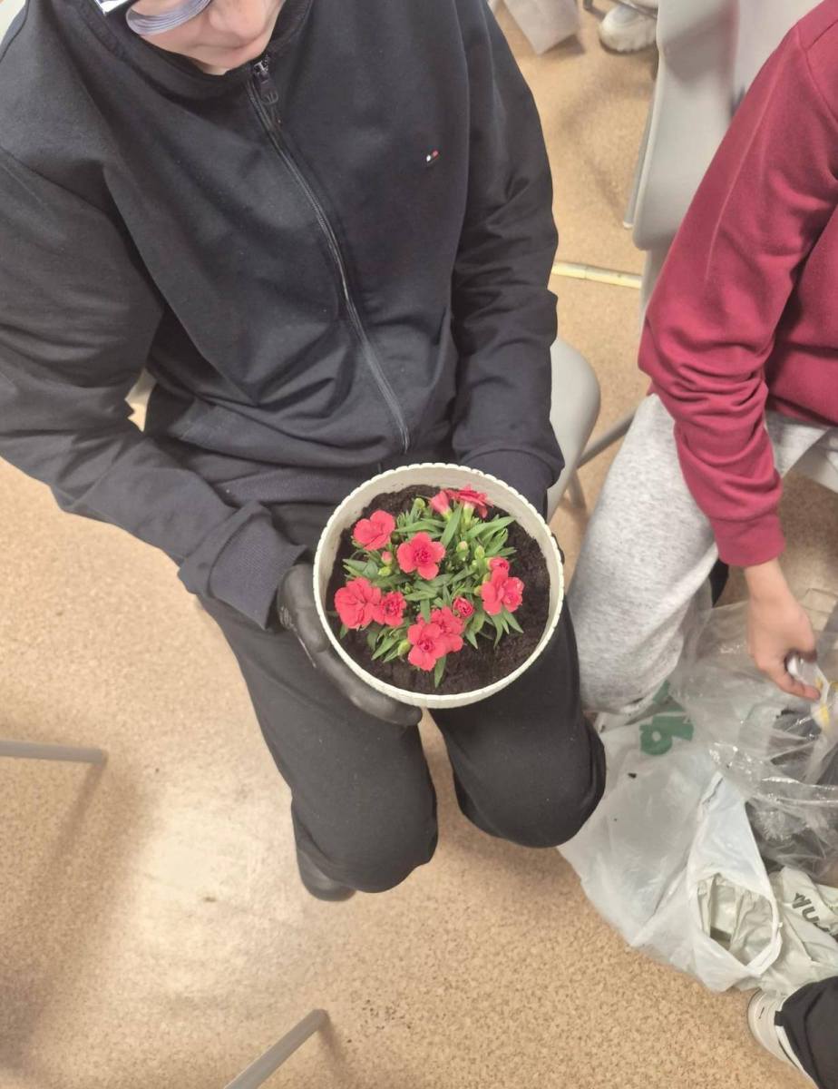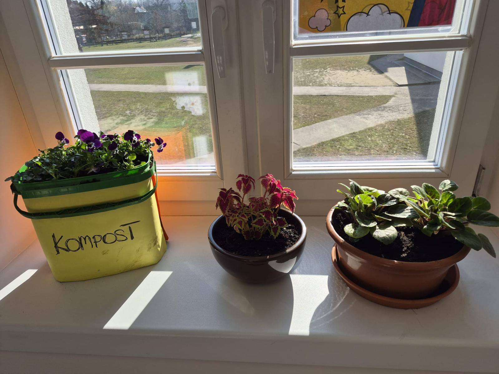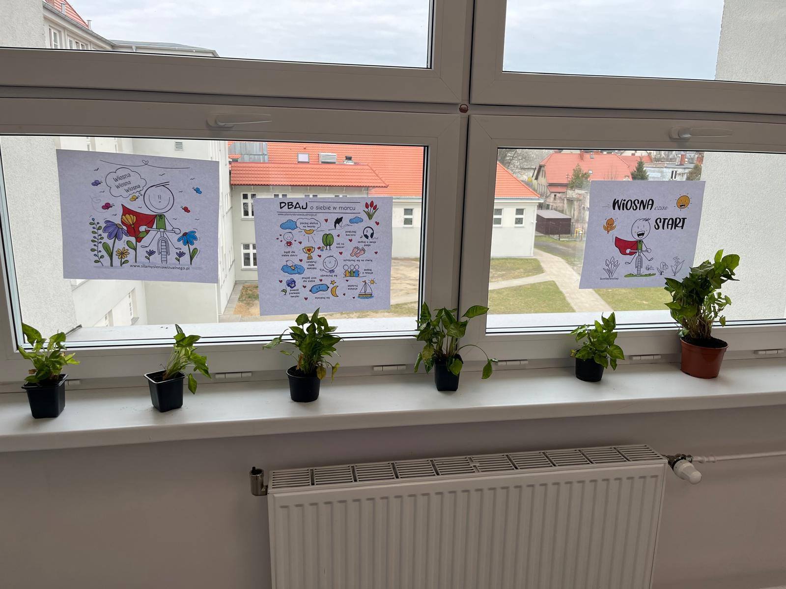 Dzięki ich pracy nasze okna zyskały piękną, zieloną dekorację – teraz zdobią je kolorowe kwiaty, które wprowadzają do sali jeszcze więcej radości i świeżości.
